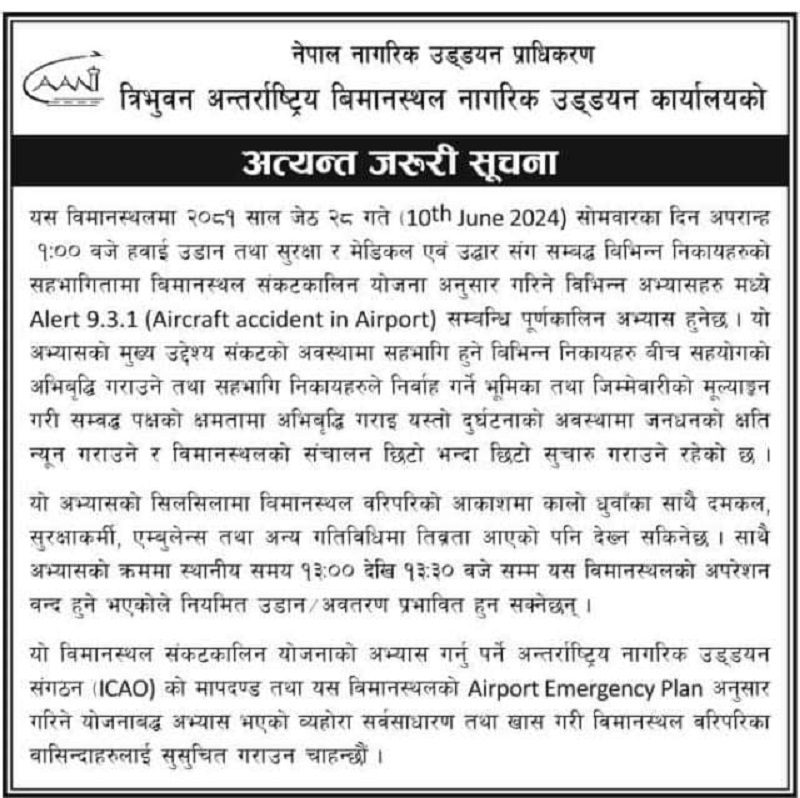 अन्तर्राष्ट्रिय नागरिक उड्डयन प्राधिरणको मापदण्डअनुसार विमानस्थलमा आइपर्न सक्ने विभिन्न आपत्कालीन अवस्थामा प्रतिकार्यको लागि यो अभ्यास गर्न लागिएको सर्वसाधारण तथा विमानस्थल वरिपरिका बासिन्दाहरुलाई यसै सुचना मार्फत प्राधिकरणले जनाकारी गराएको छ ।